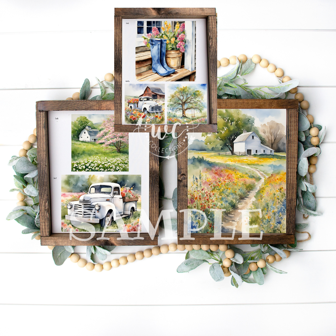 From flower-lined paths and white farmhouses to classic trucks, blooming trees, and simple porch moments, these prints bring warmth and calm to your seasonal decor while feeling timeless enough to enjoy all year long.
