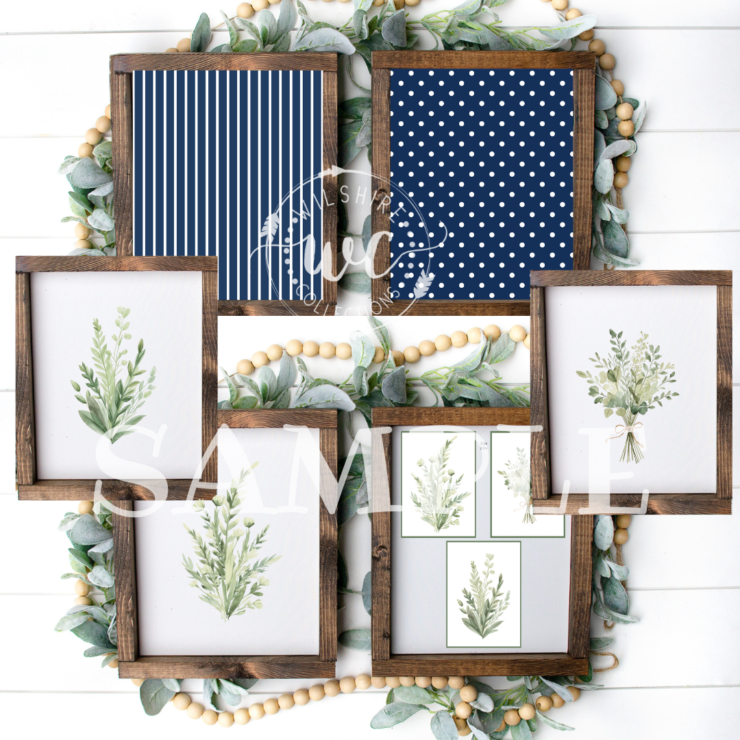 This bundle features elegant navy stripes and polka dots paired with delicate watercolor greenery and botanical stems. It’s perfect for creating custom wood signs, framed art, shelf decor, tiered trays, and everyday home accents that work year-round.