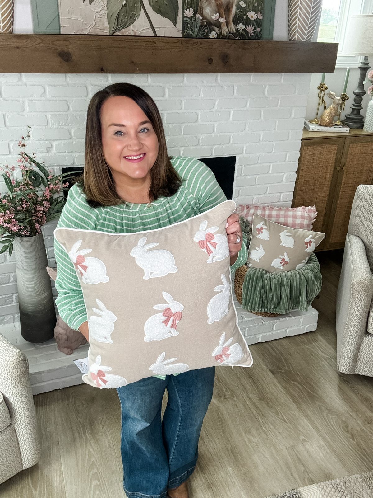 Add the sweetest touch of spring to your home with our Bunnies and Bows Pillow Cover by Wilshire Collections. This adorable design features soft white bunny appliqués accented with charming brown bows, all set on a neutral linen-look background that makes it easy to style with your existing decor. Whether you’re decorating for Easter or just love a cozy cottage feel, this pillow cover brings warmth and personality to any space.